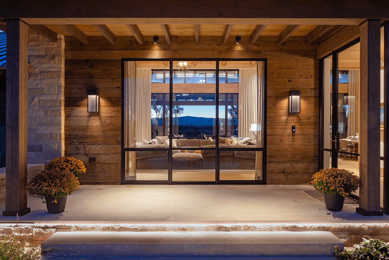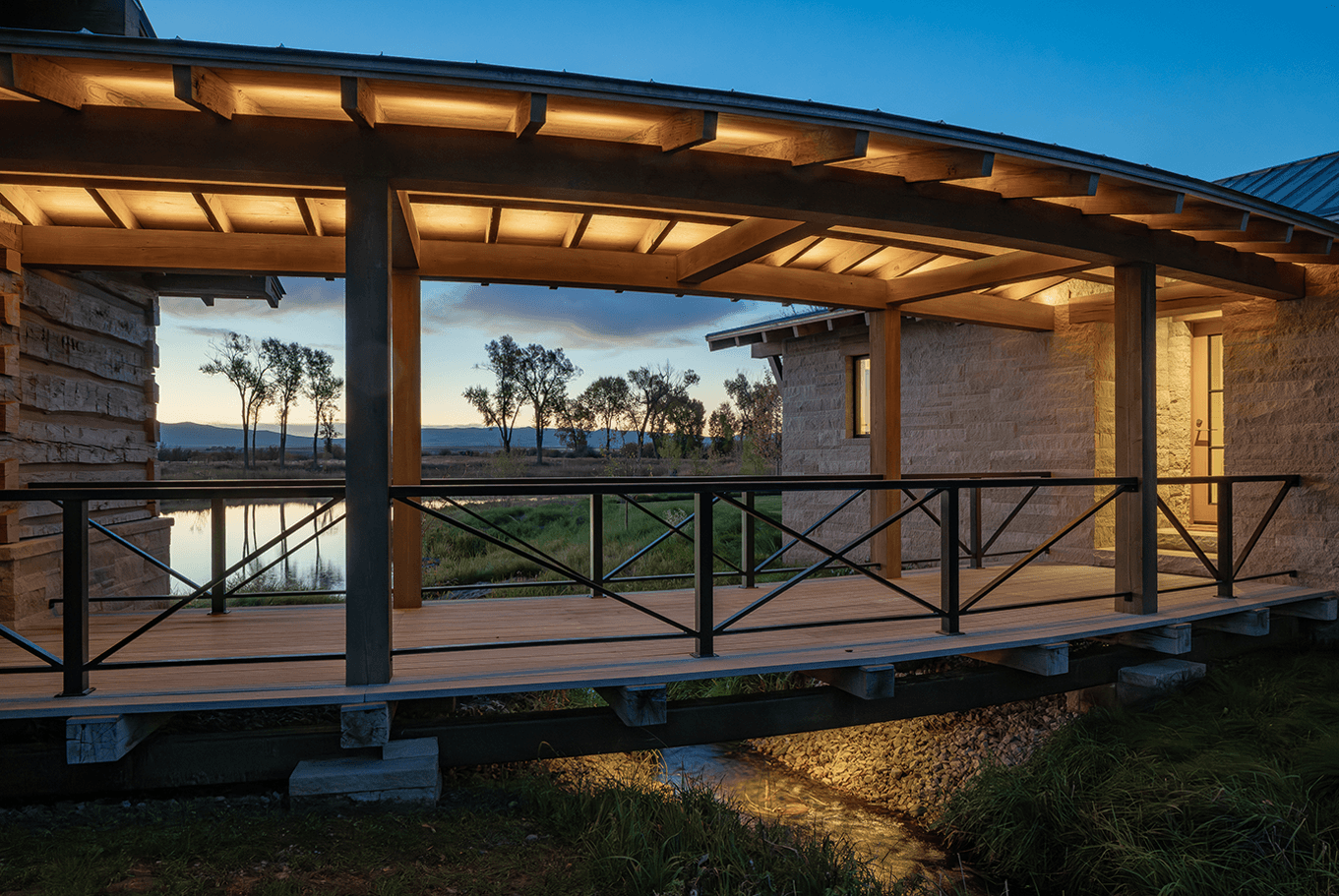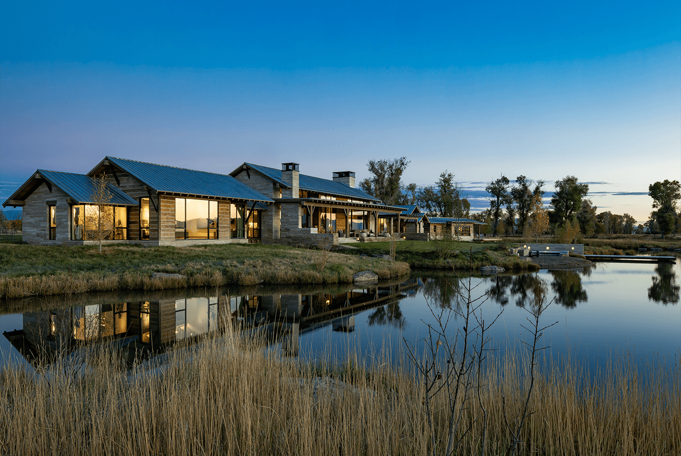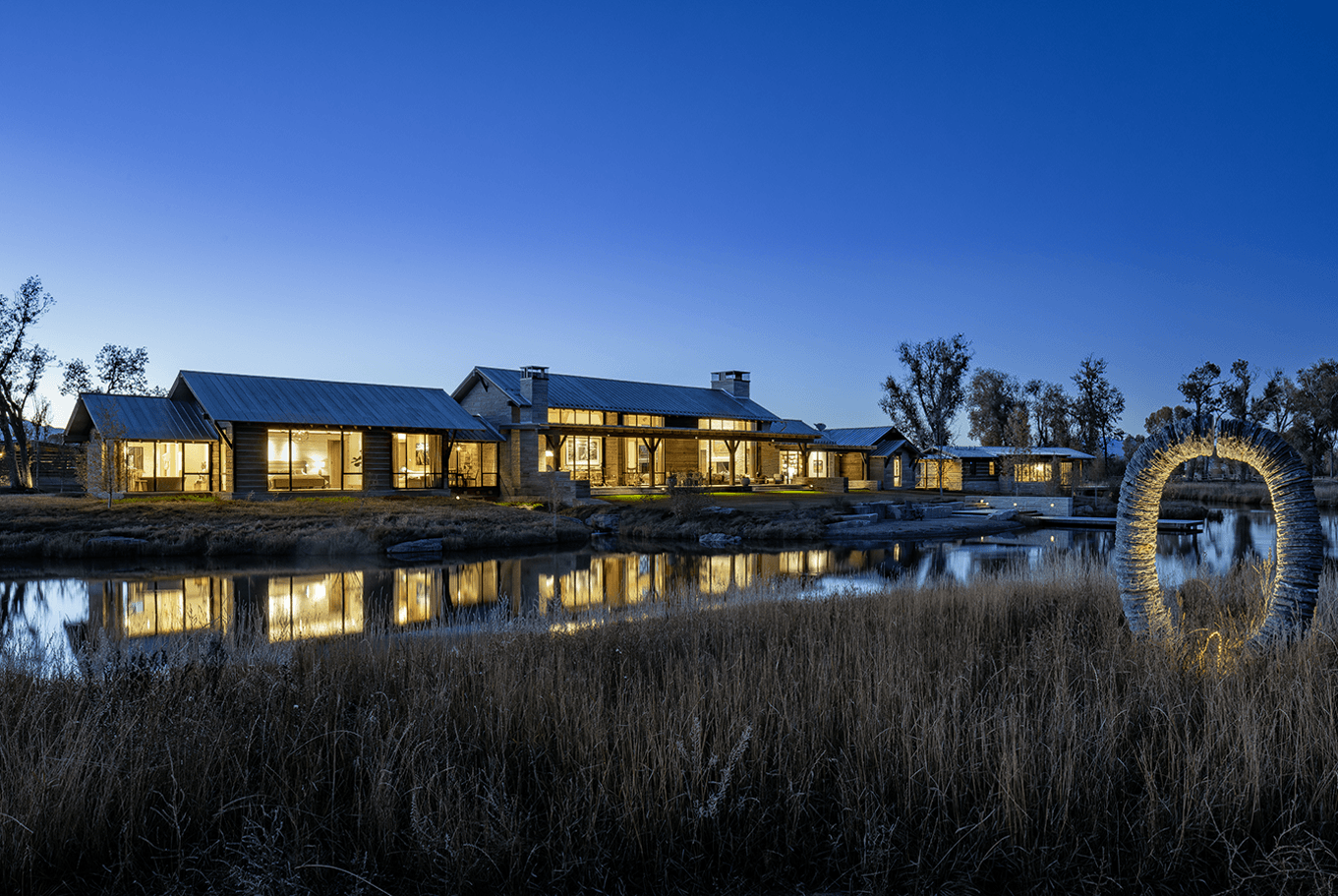 Serene landscapes and restored fishing waters surround this legacy homestead. Recessed architectural lighting provides the base task lighting, allowing the owner’s decorative fixtures to shine through. Streams pass below the connecting wings of the home, offering many gathering spaces to create lasting memories.