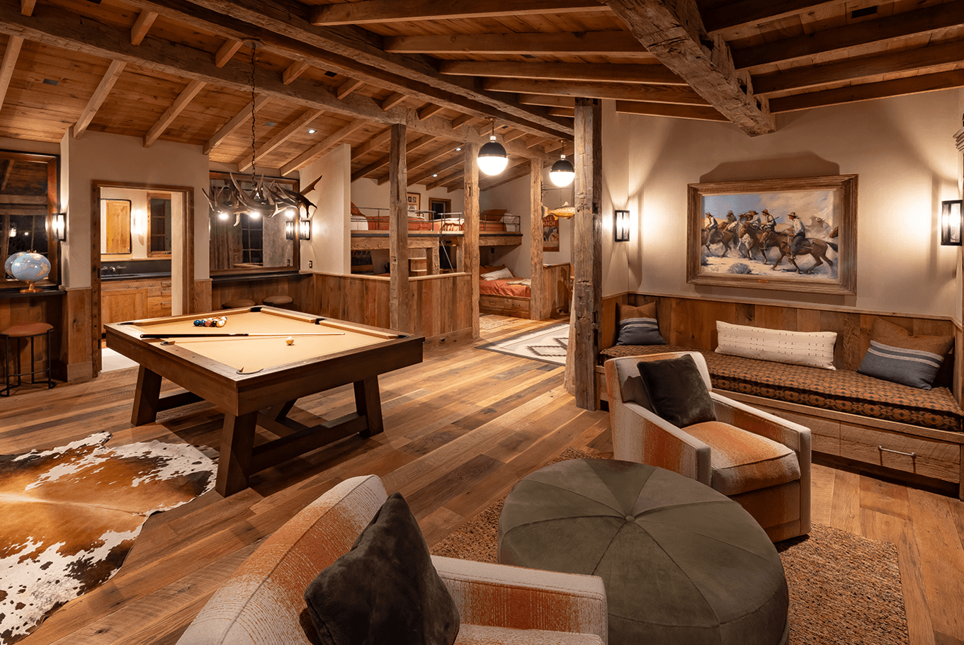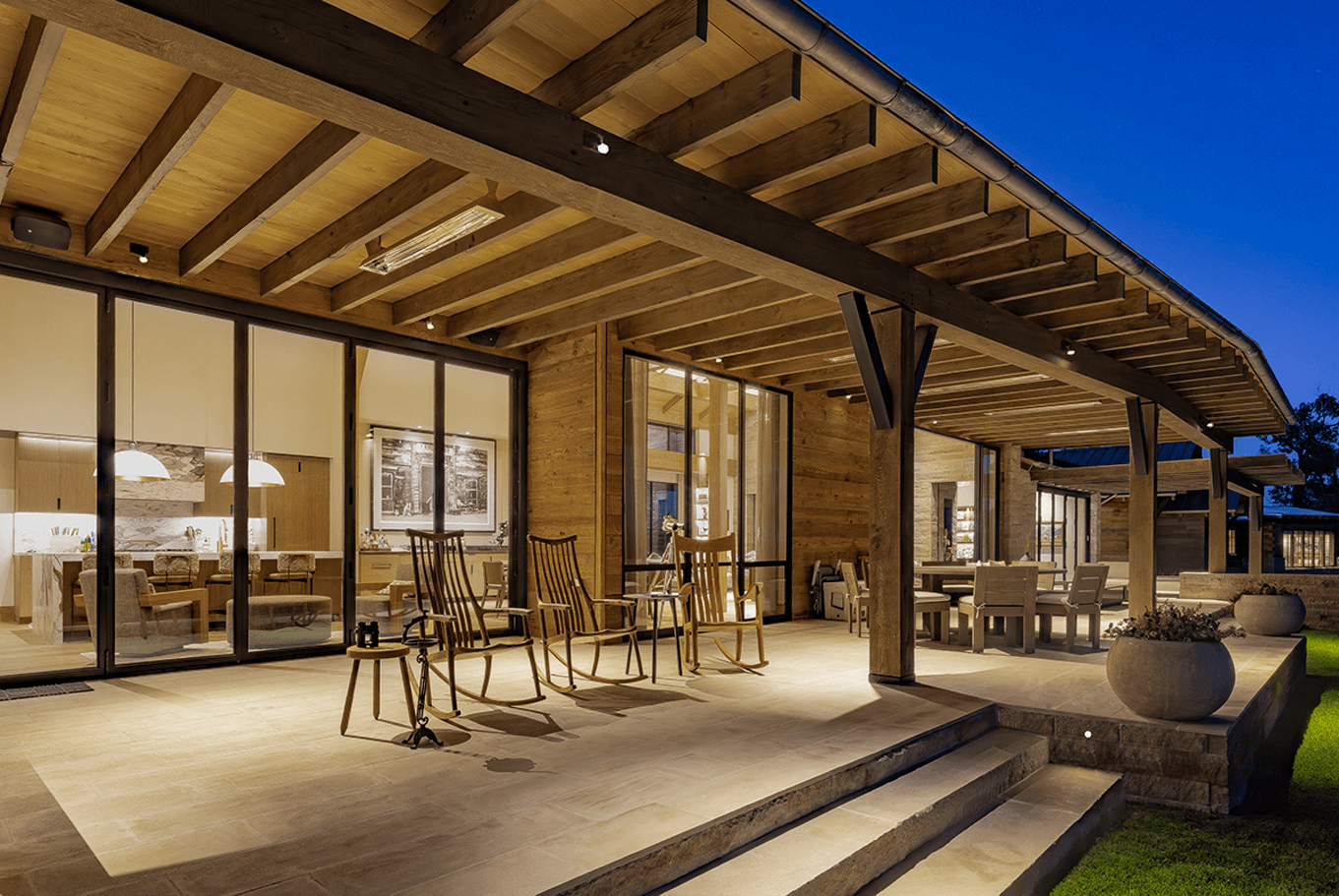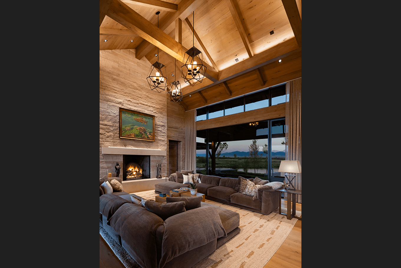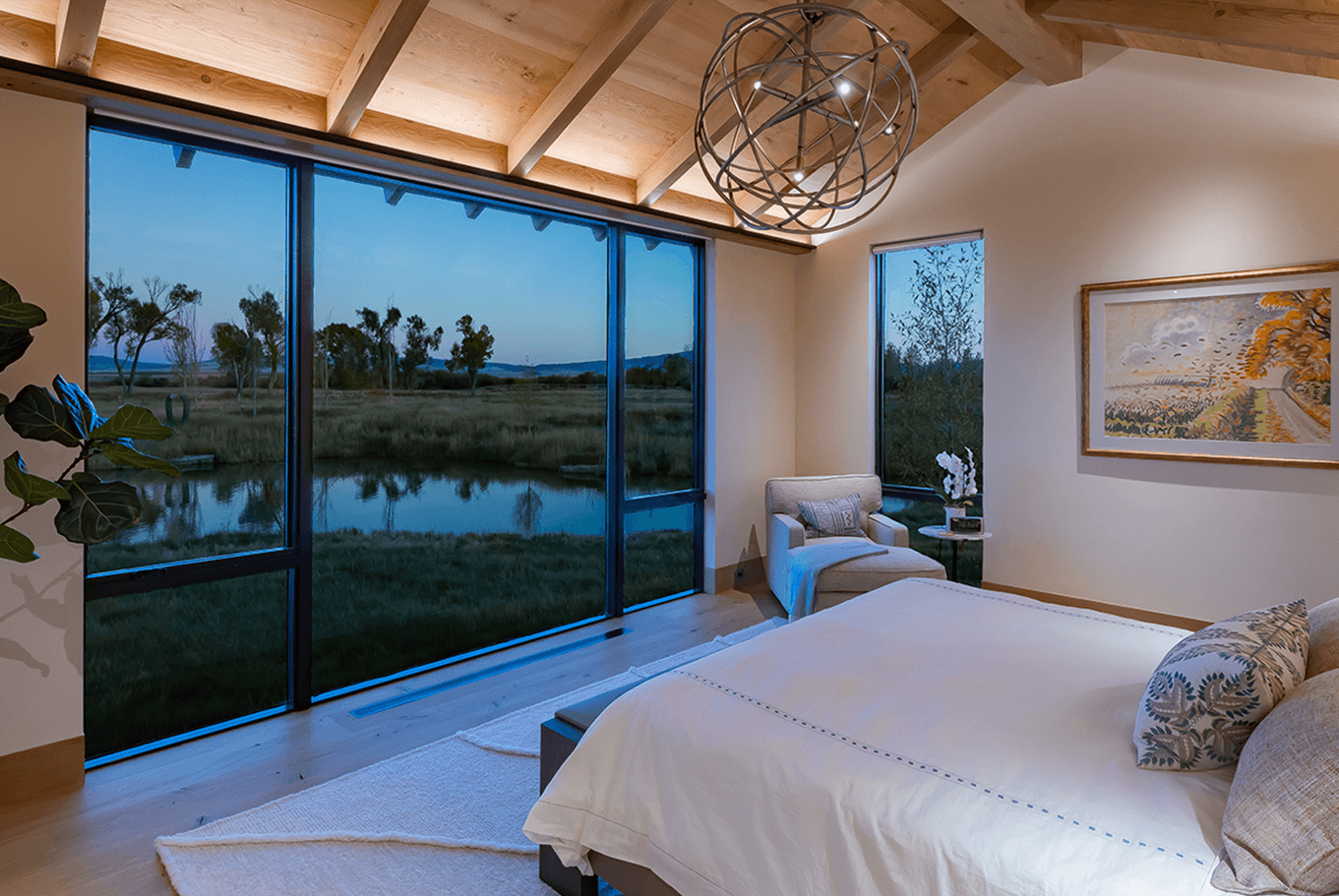 Serene landscapes and restored fishing waters surround this legacy homestead. Recessed architectural lighting provides the base task lighting, allowing the owner’s decorative fixtures to shine through. Streams pass below the connecting wings of the home, offering many gathering spaces to create lasting memories.
