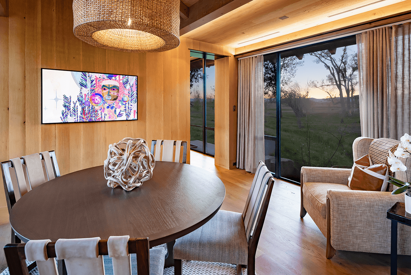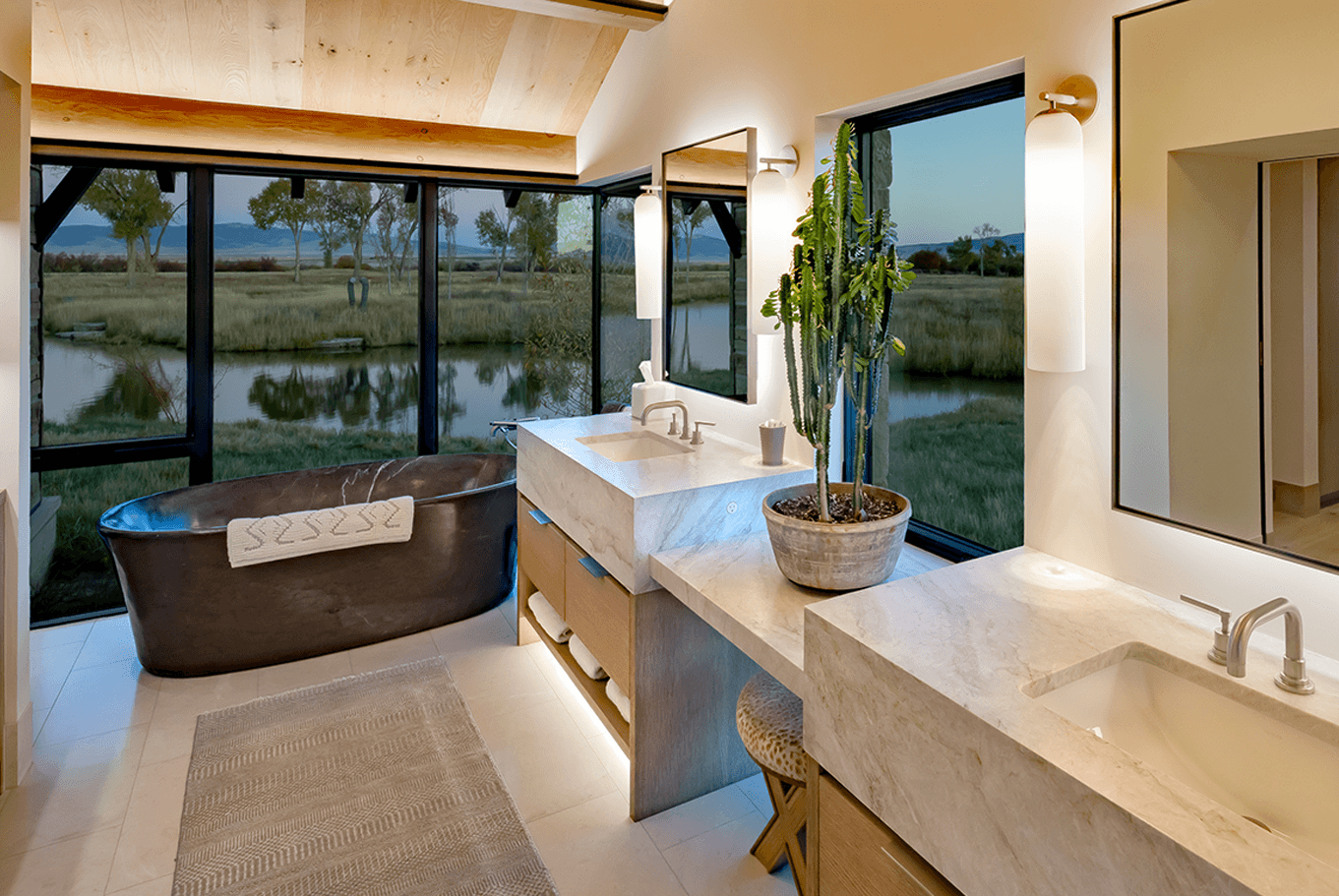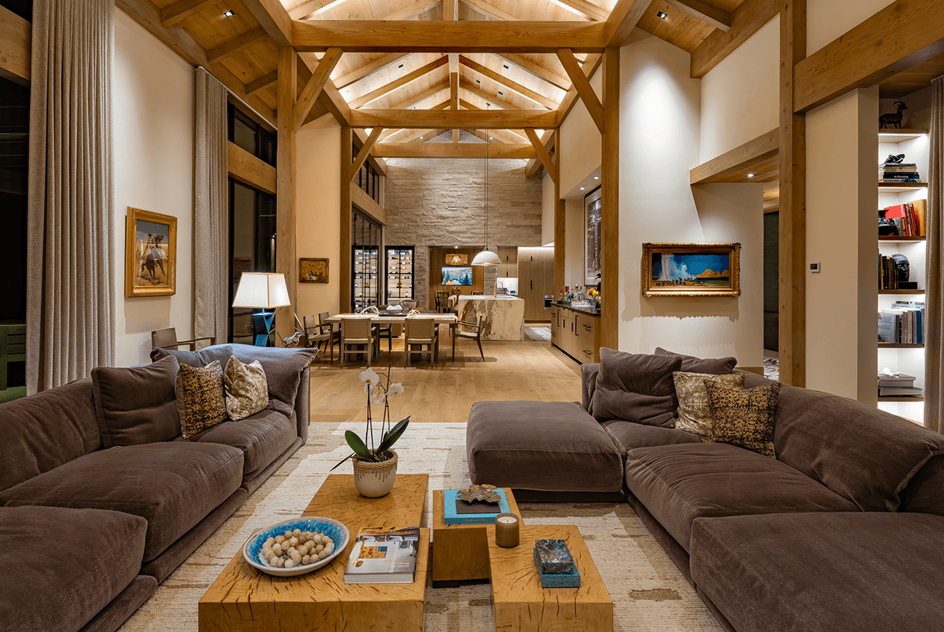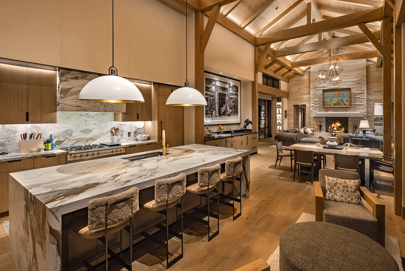 Serene landscapes and restored fishing waters surround this legacy homestead. Recessed architectural lighting provides the base task lighting, allowing the owner’s decorative fixtures to shine through. Streams pass below the connecting wings of the home, offering many gathering spaces to create lasting memories.