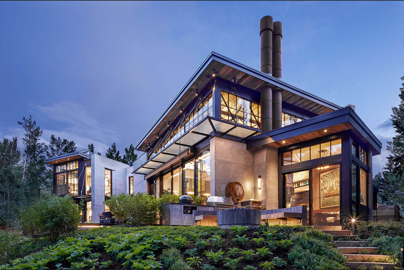 Unique and perfectly tailored to the homeowners’ style and personalities, this eclectic river house celebrates collections curated from around the world. Architectural details are emphasized with various lighting styles creating a foundation to experience the home. Linear lighting runs along steel elements, reinforcing the metal structure while in grade uplights graze the curved board-form concrete wall, emphasizing it’s craftmanship. Recessed lighting blends seamlessly into plaster ceilings encouraging closer viewing of the various wall hangings. The lighting works as a discreet element, used to emphasize the architecture and collections.