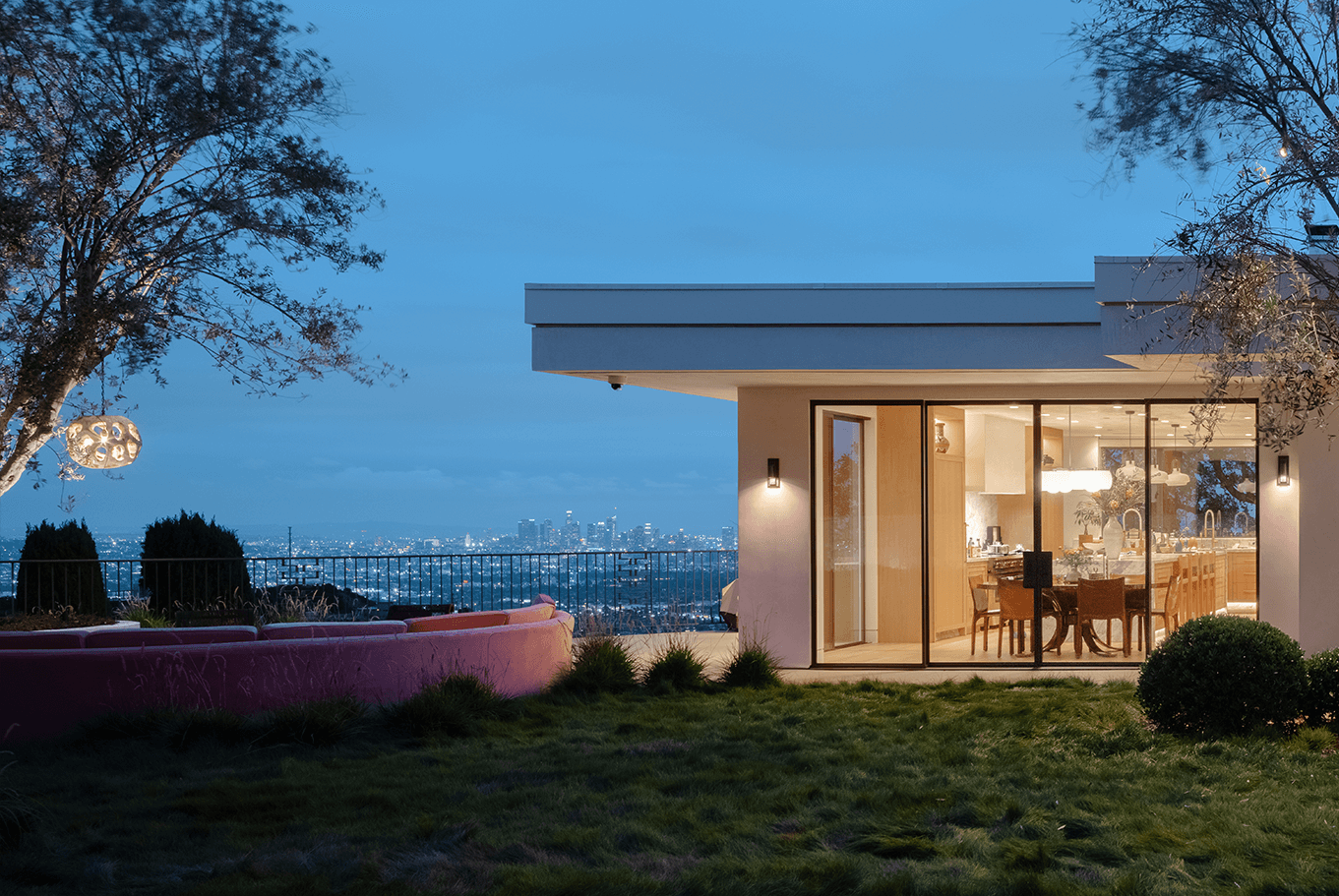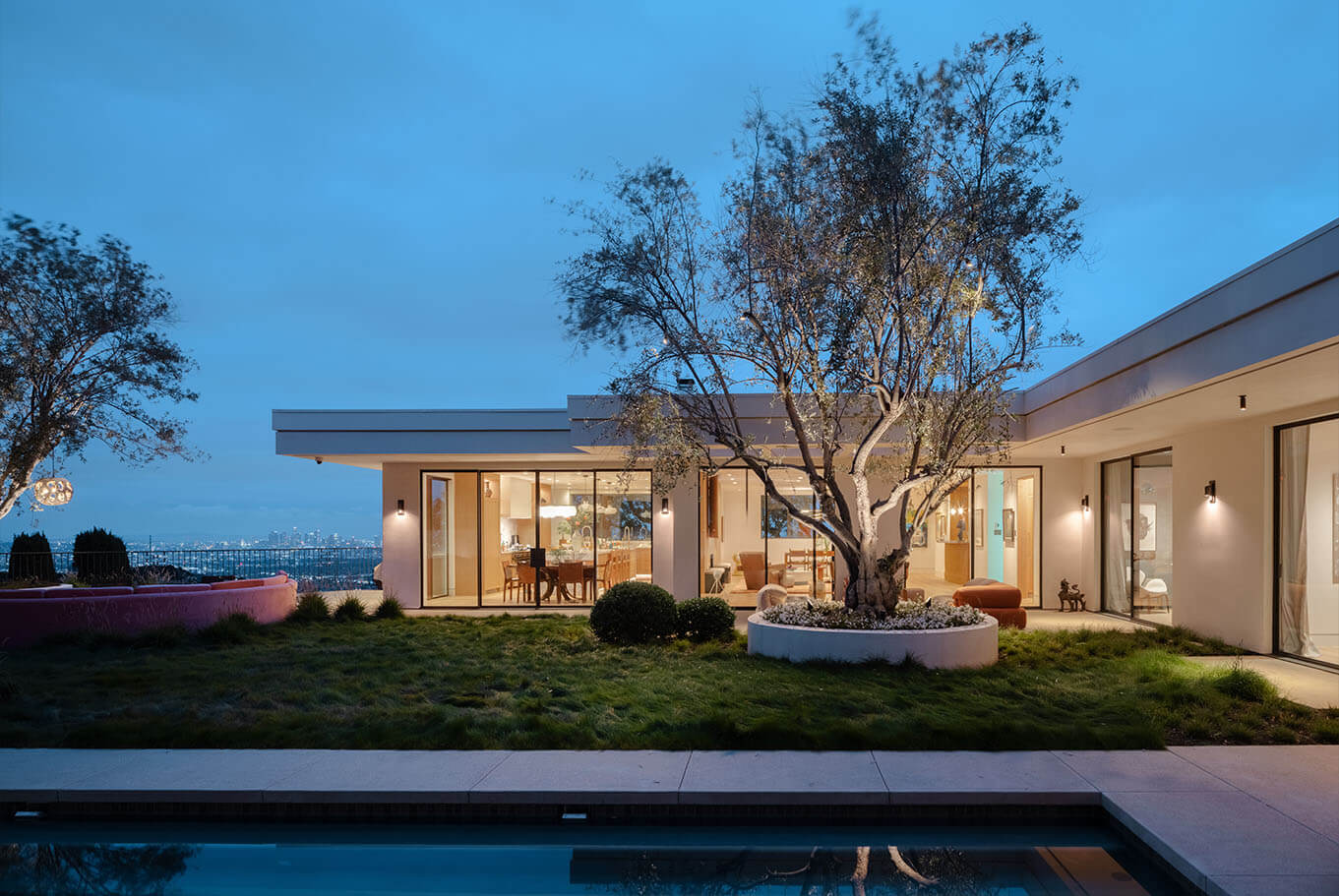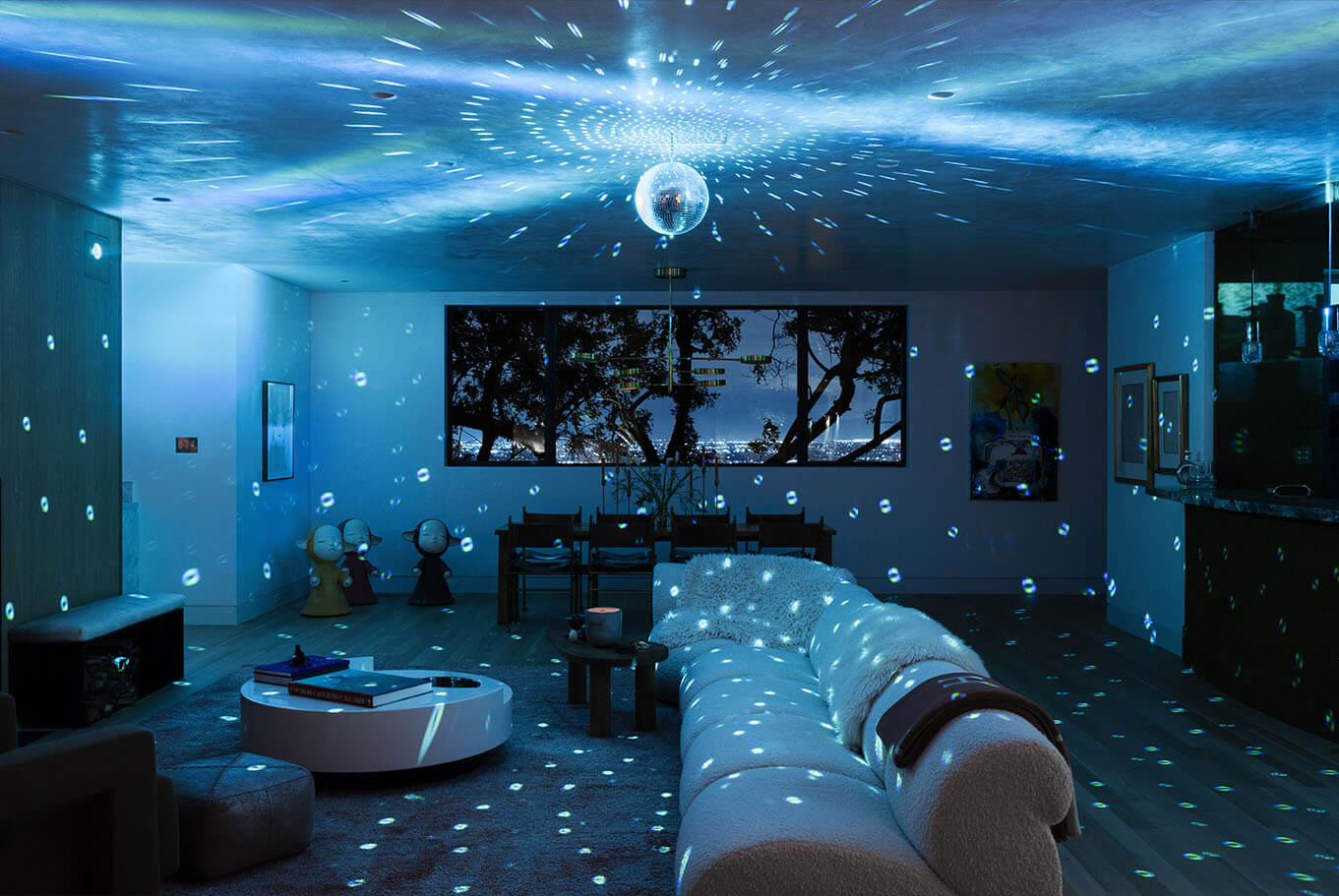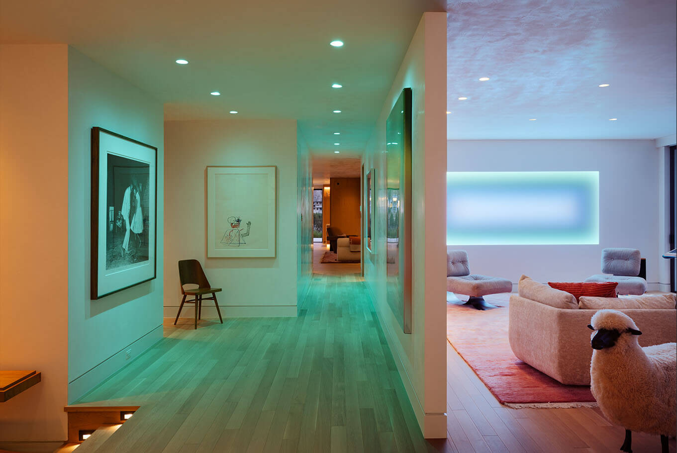 Reimagining an original Beverly Hills mid-century jewel into a timeless design balanced with modern amenities, this home flows between time and space. A James Turrell installation envelopes the formal living room with constantly cycling saturated color while linear lighting provides task lighting at counters and shelving. Full spectrum downlights throughout the living spaces can mimic natural daylight or embrace the mirror ball in the great room that reflects on the home’s design precedence.