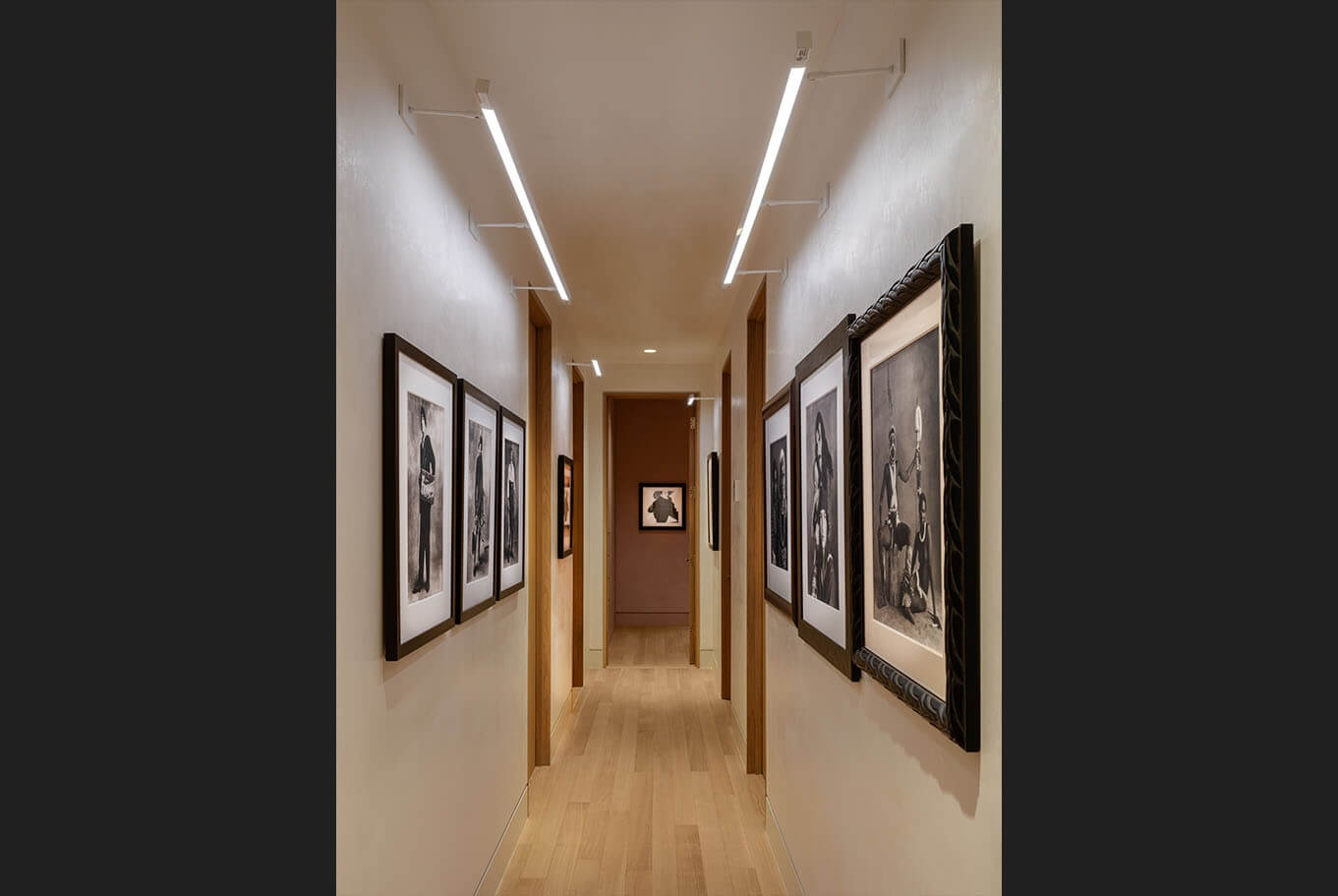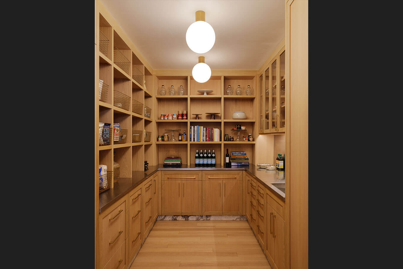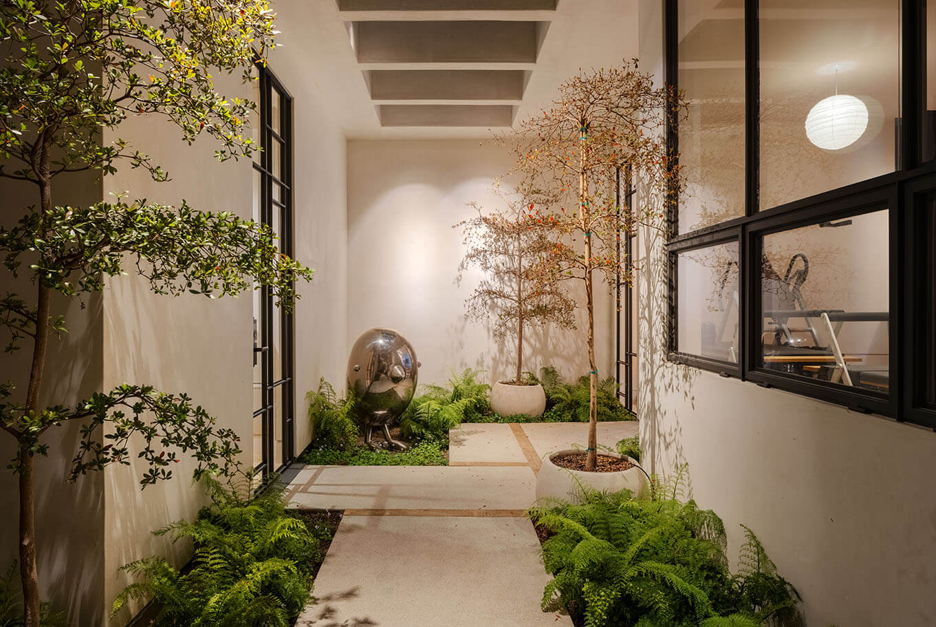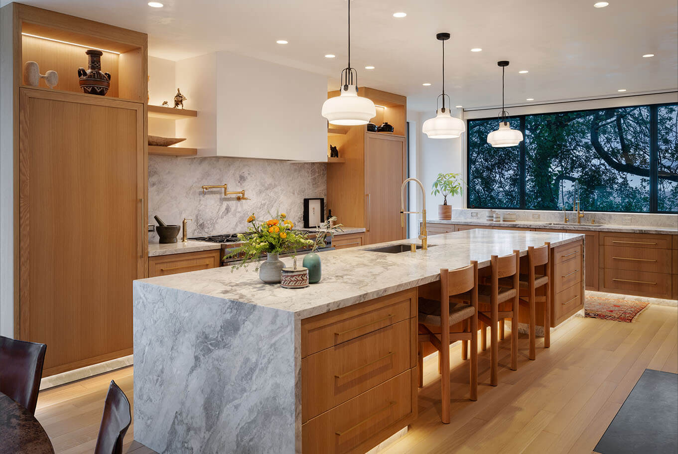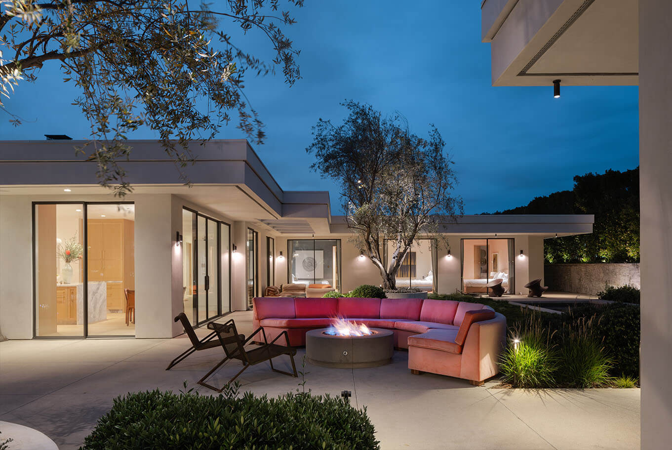 Reimagining an original Beverly Hills mid-century jewel into a timeless design balanced with modern amenities, this home flows between time and space. A James Turrell installation envelopes the formal living room with constantly cycling saturated color while linear lighting provides task lighting at counters and shelving. Full spectrum downlights throughout the living spaces can mimic natural daylight or embrace the mirror ball in the great room that reflects on the home’s design precedence.