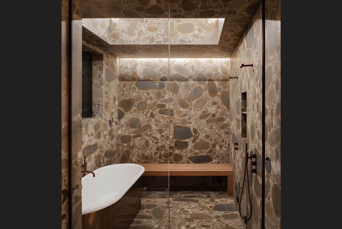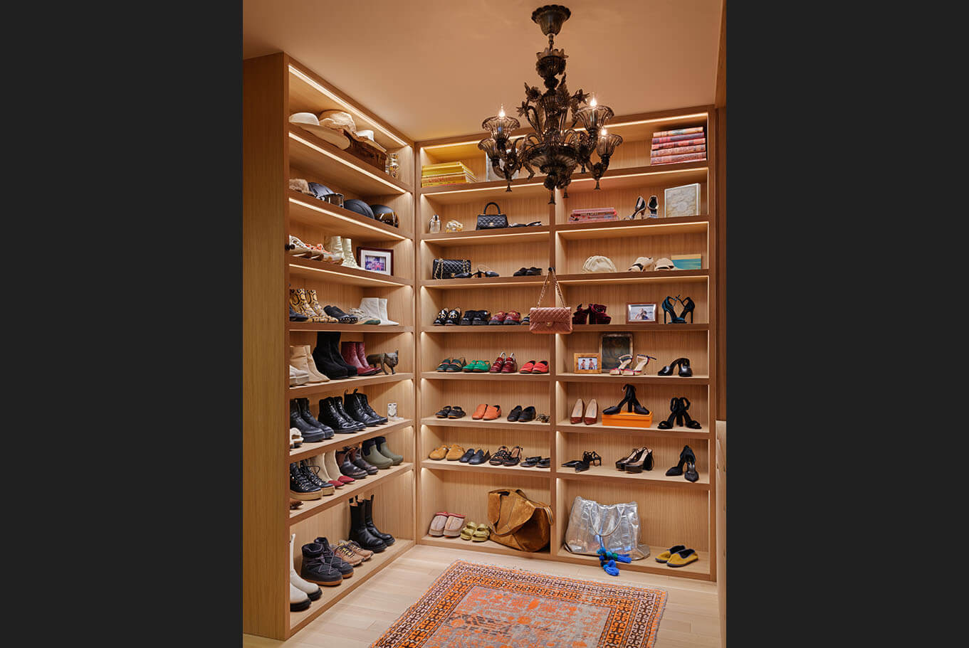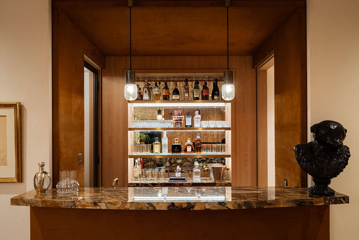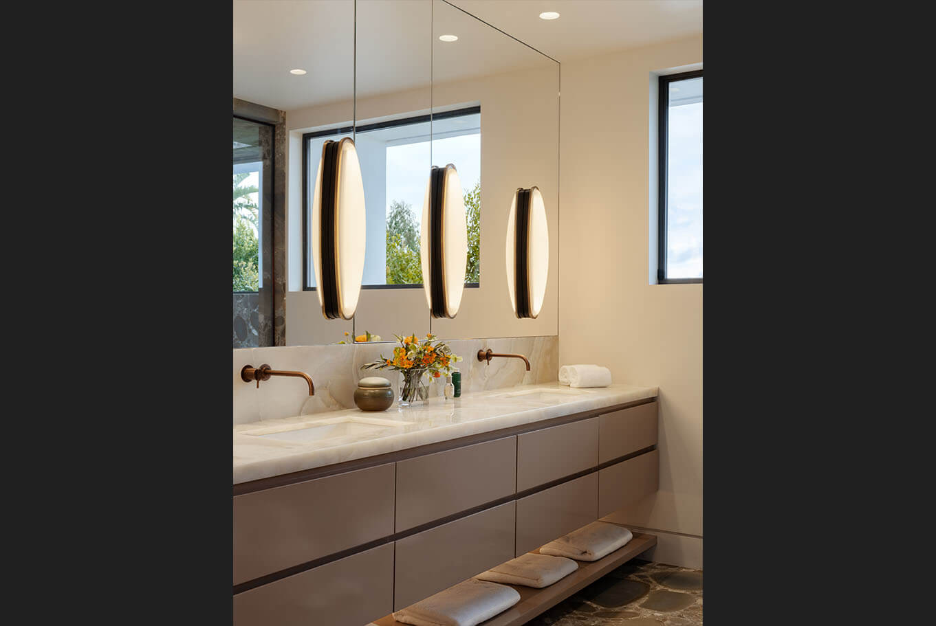 Reimagining an original Beverly Hills mid-century jewel into a timeless design balanced with modern amenities, this home flows between time and space. A James Turrell installation envelopes the formal living room with constantly cycling saturated color while linear lighting provides task lighting at counters and shelving. Full spectrum downlights throughout the living spaces can mimic natural daylight or embrace the mirror ball in the great room that reflects on the home’s design precedence.