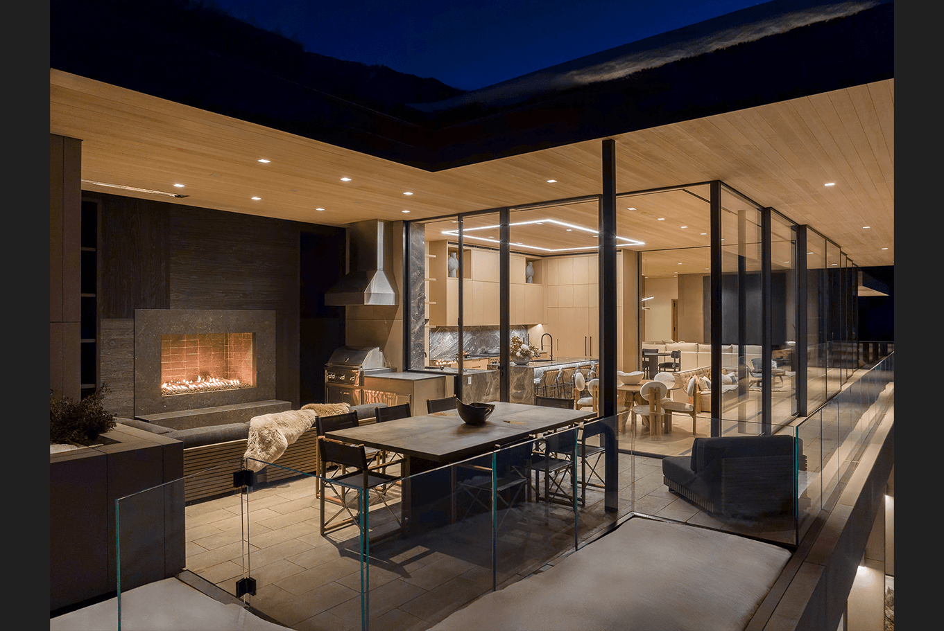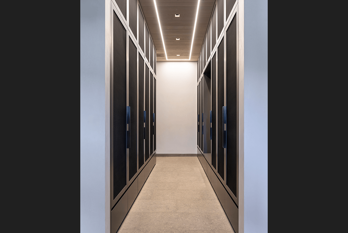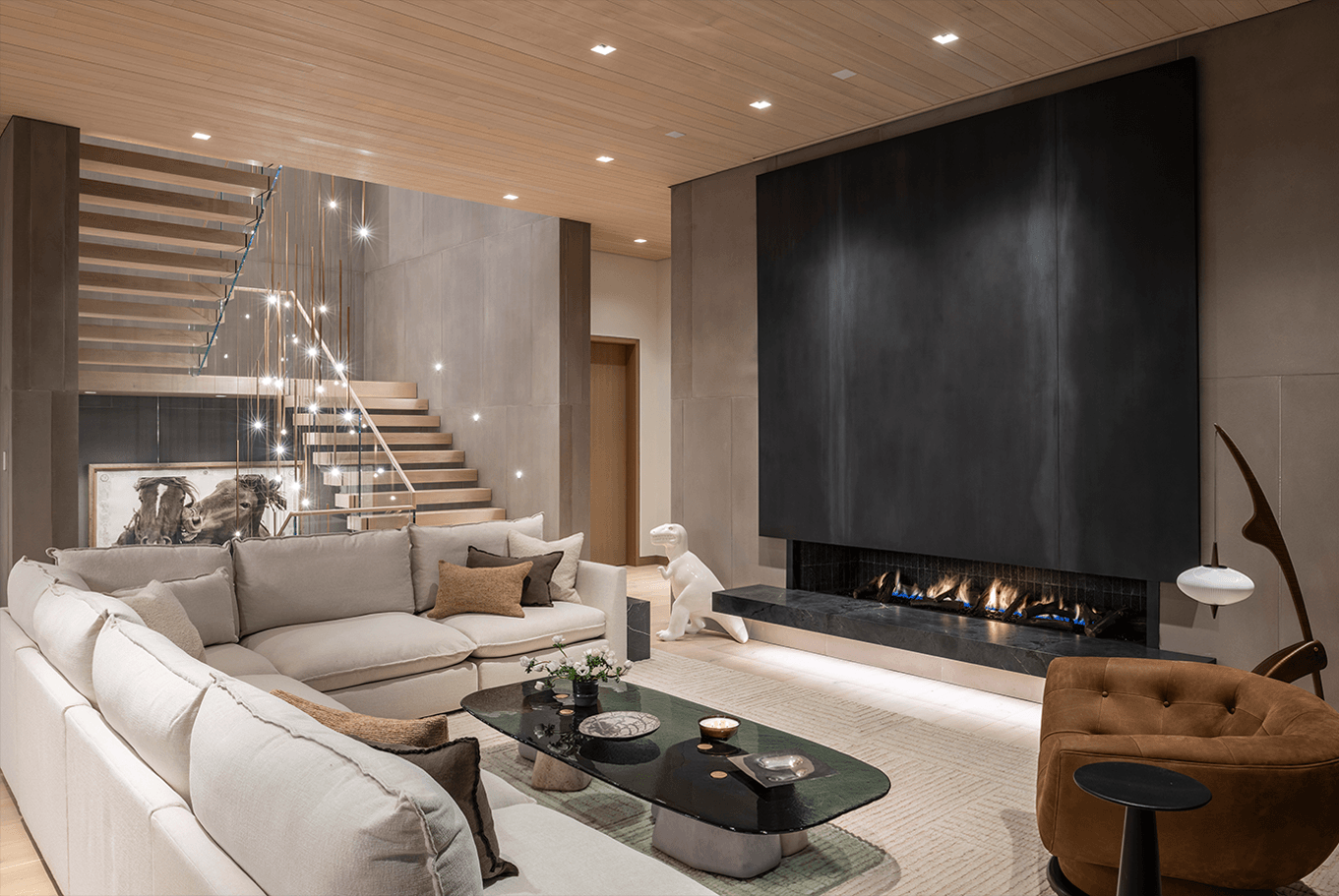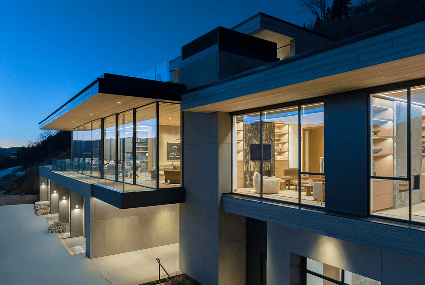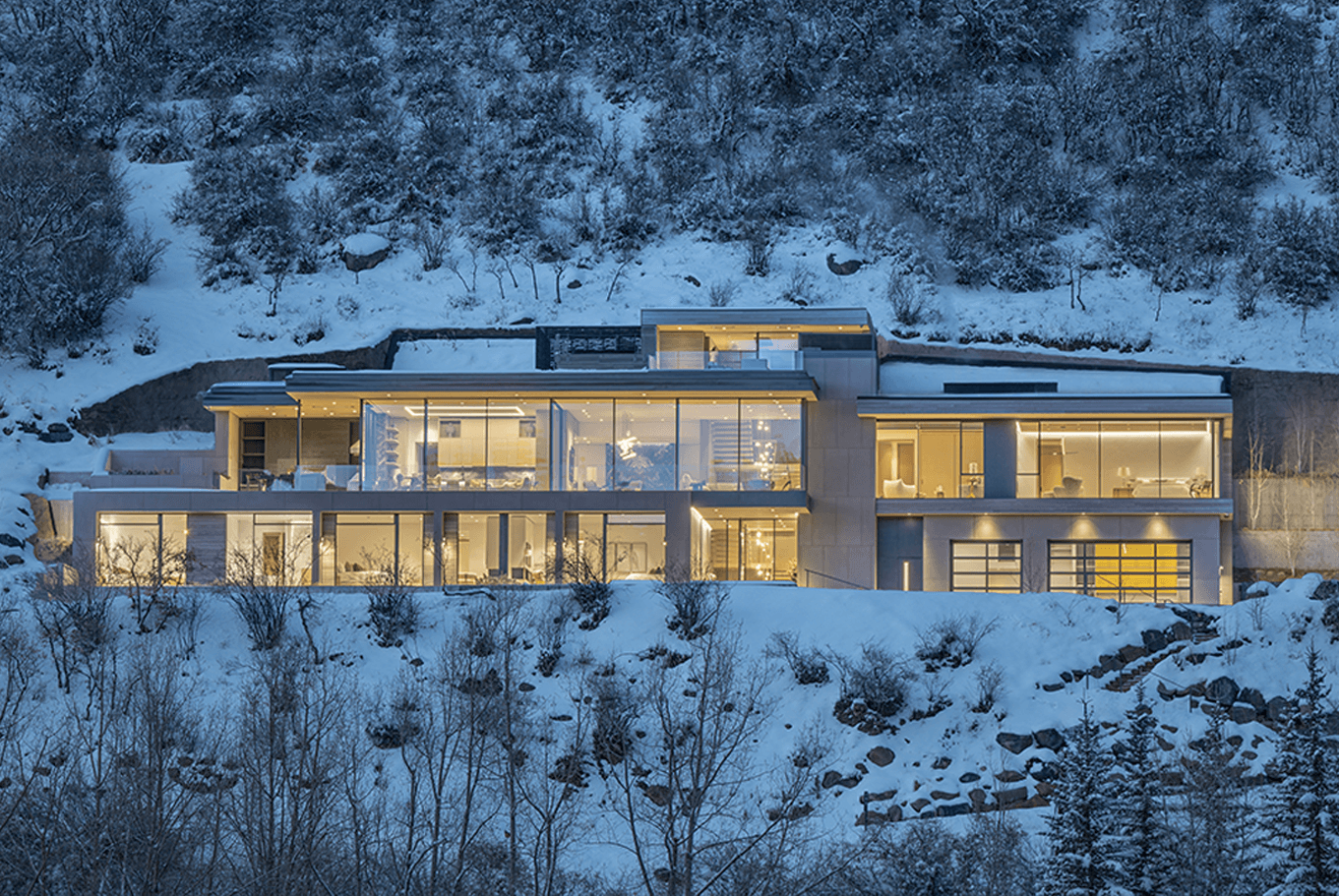 Cut into the mountainside, this tiered home captures daylight and mountain views. Linear details compliment full spectrum downlights to highlight the clean architectural forms and rich finishes.