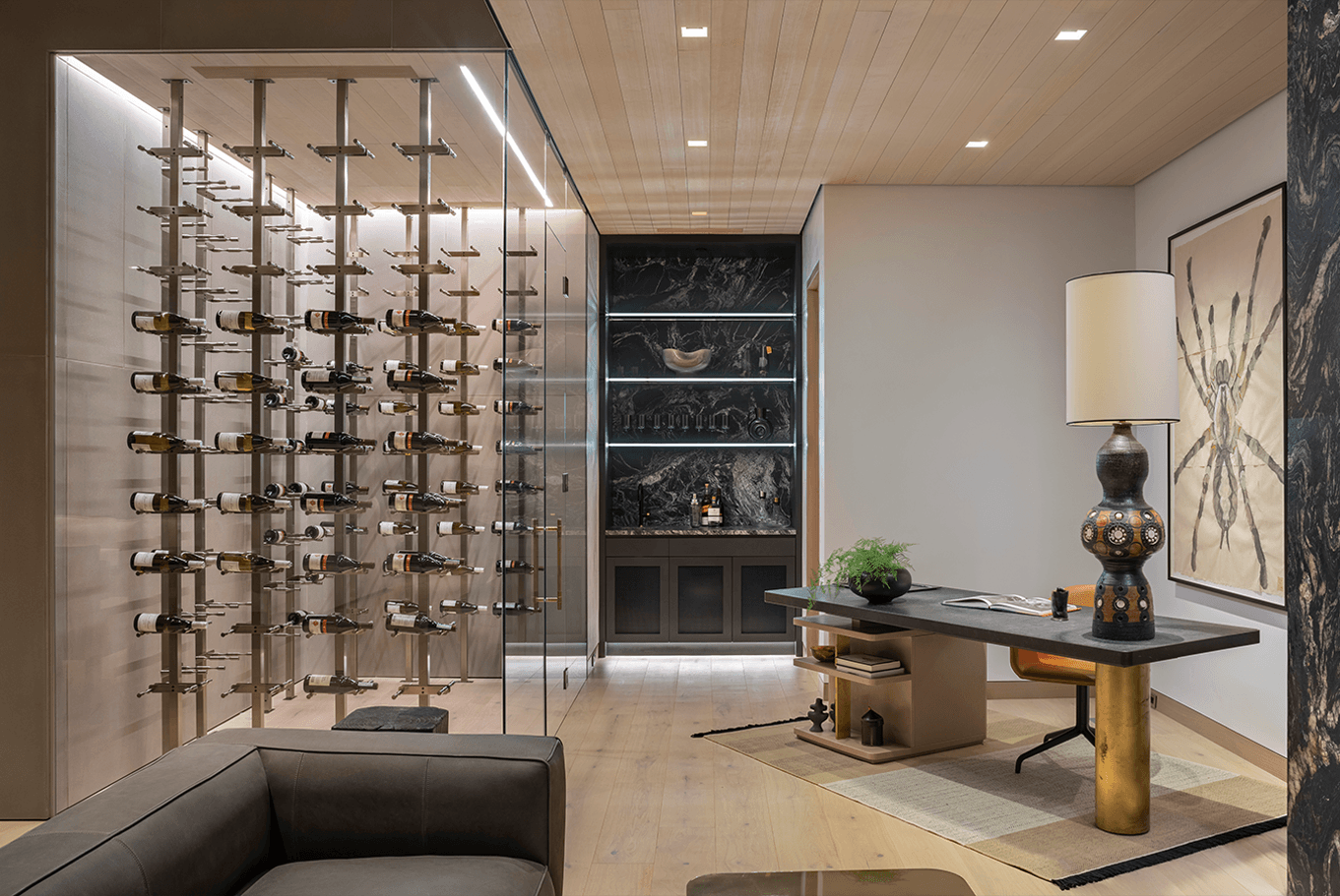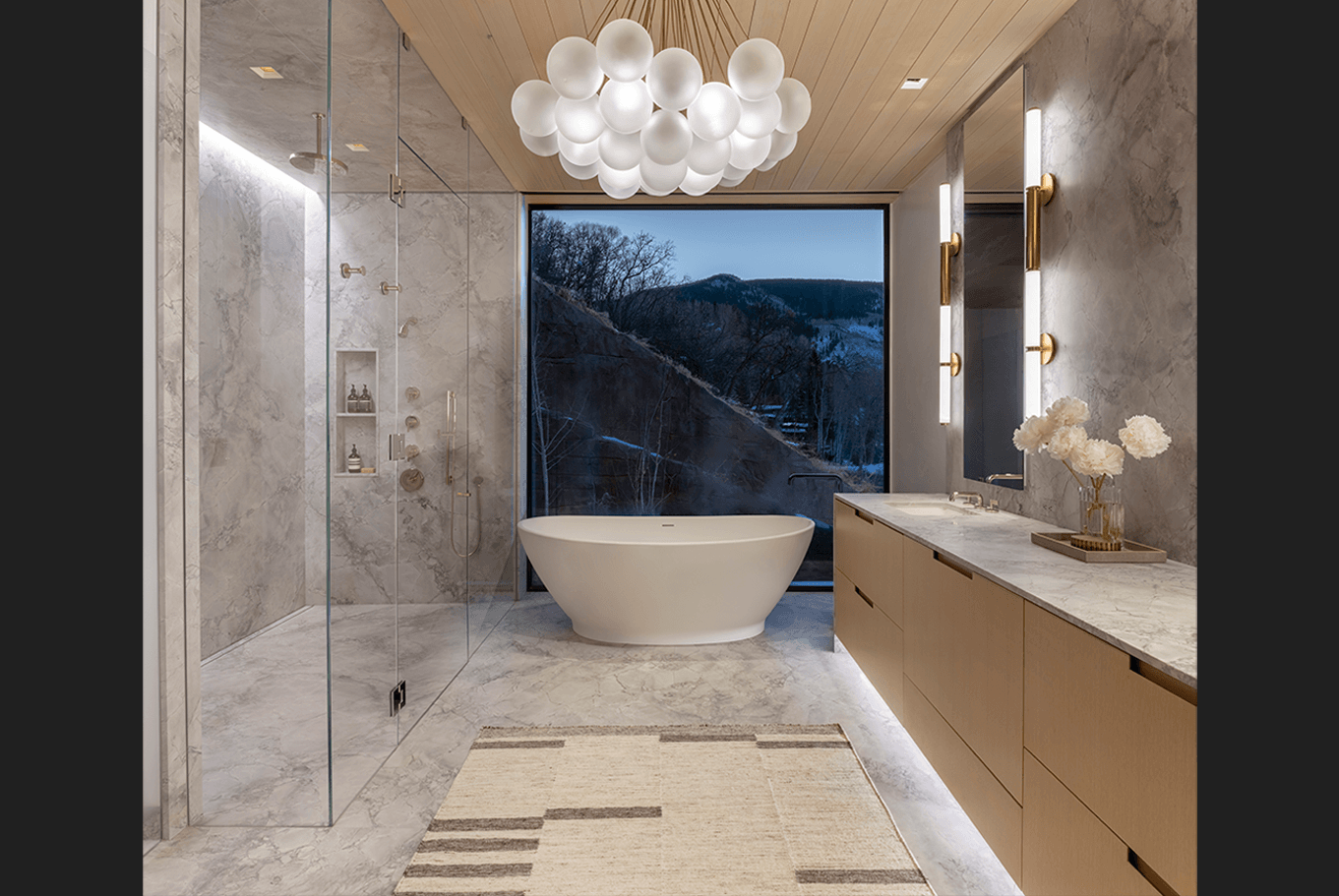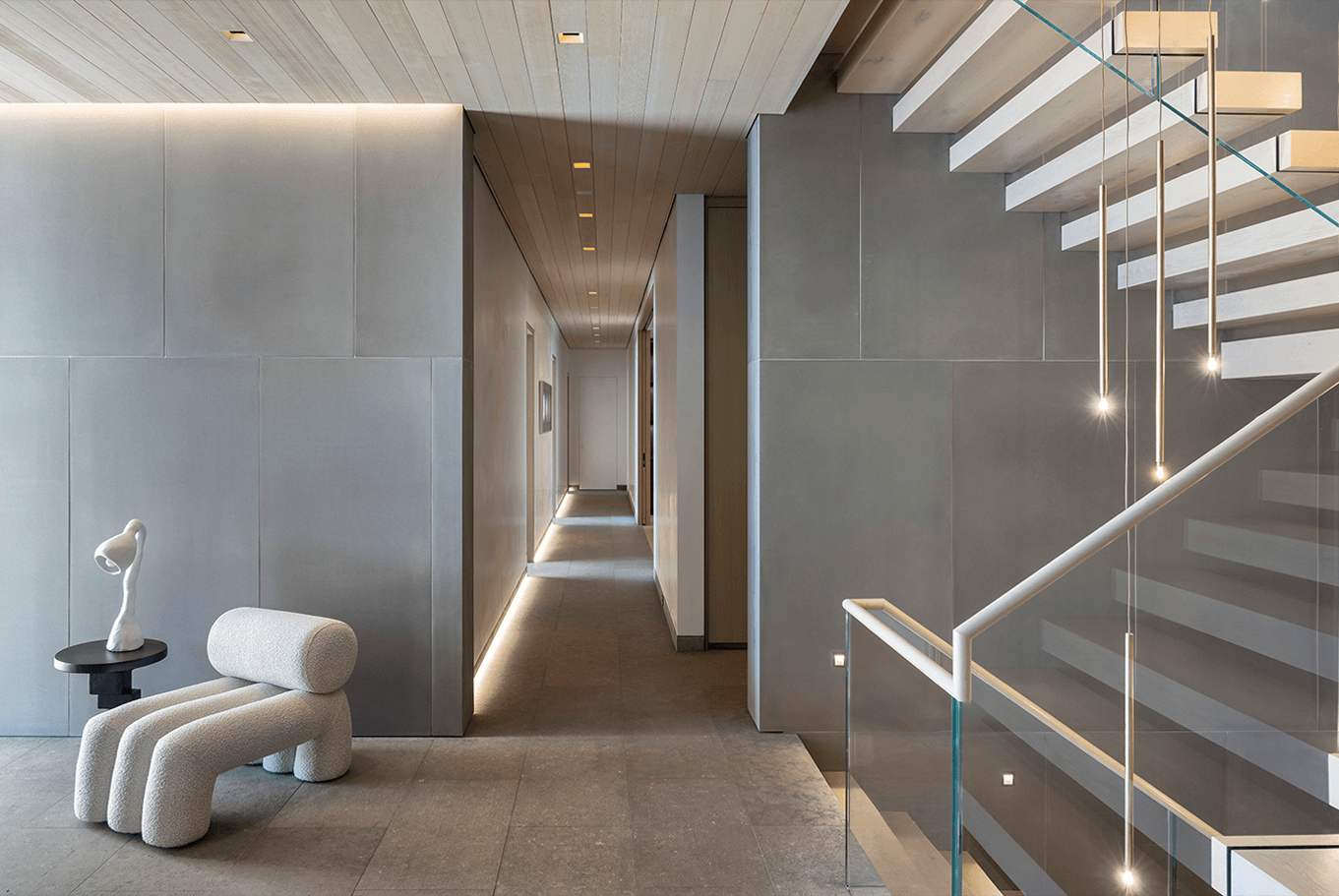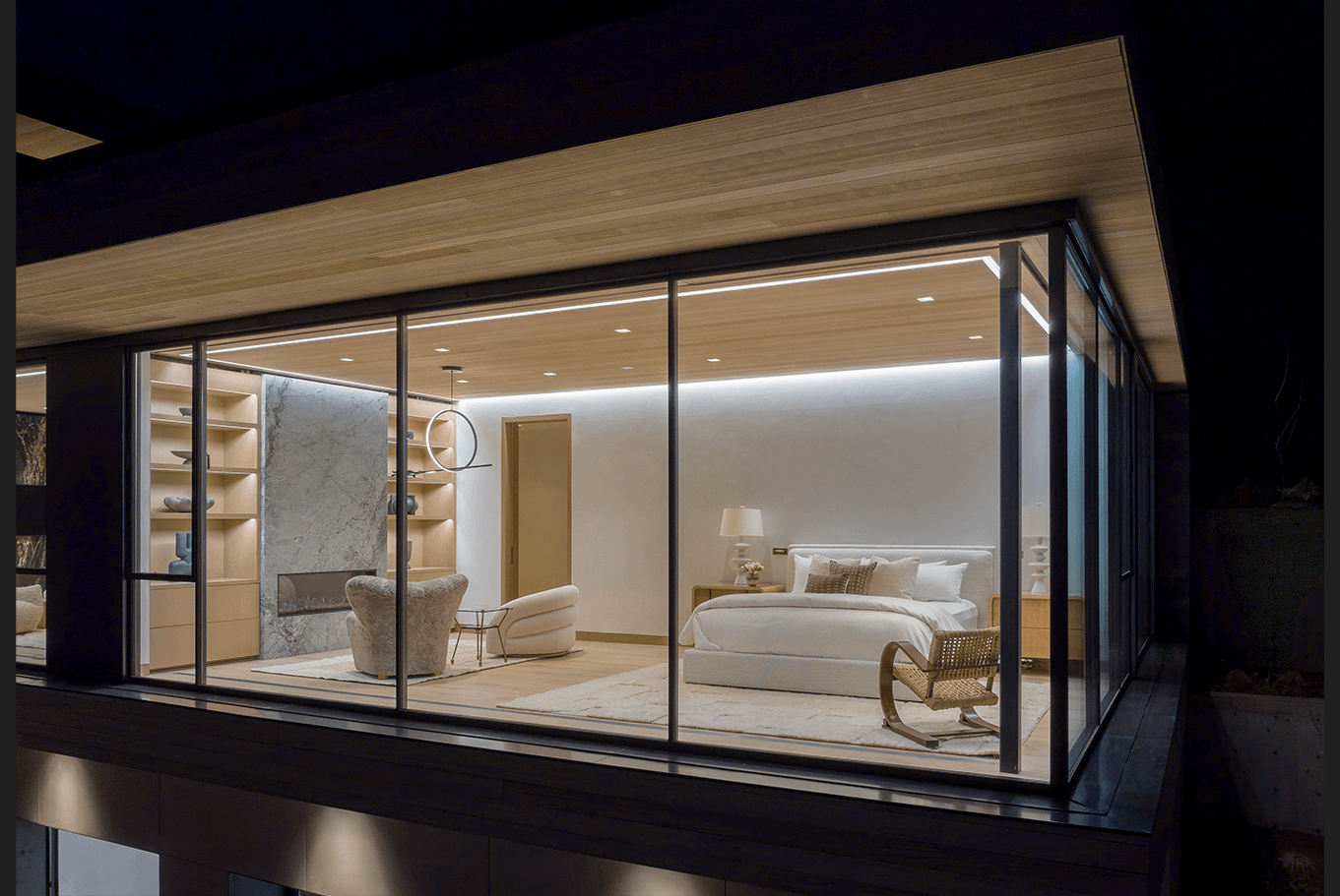 Cut into the mountainside, this tiered home captures daylight and mountain views. Linear details compliment full spectrum downlights to highlight the clean architectural forms and rich finishes.