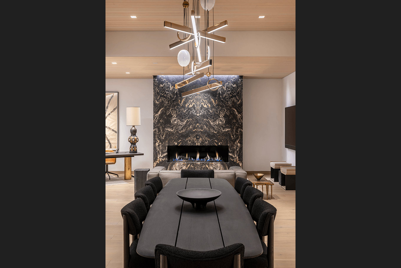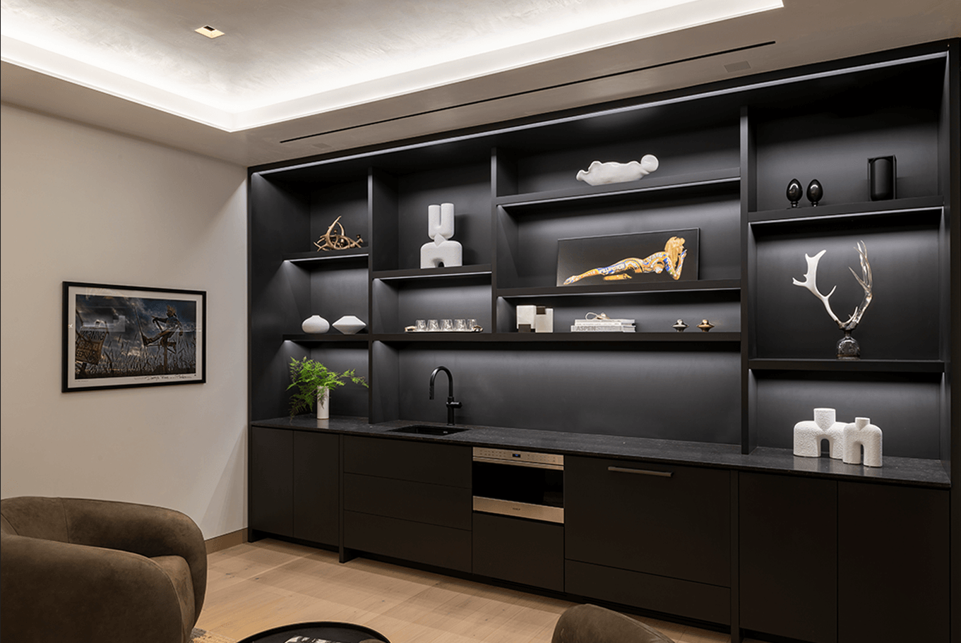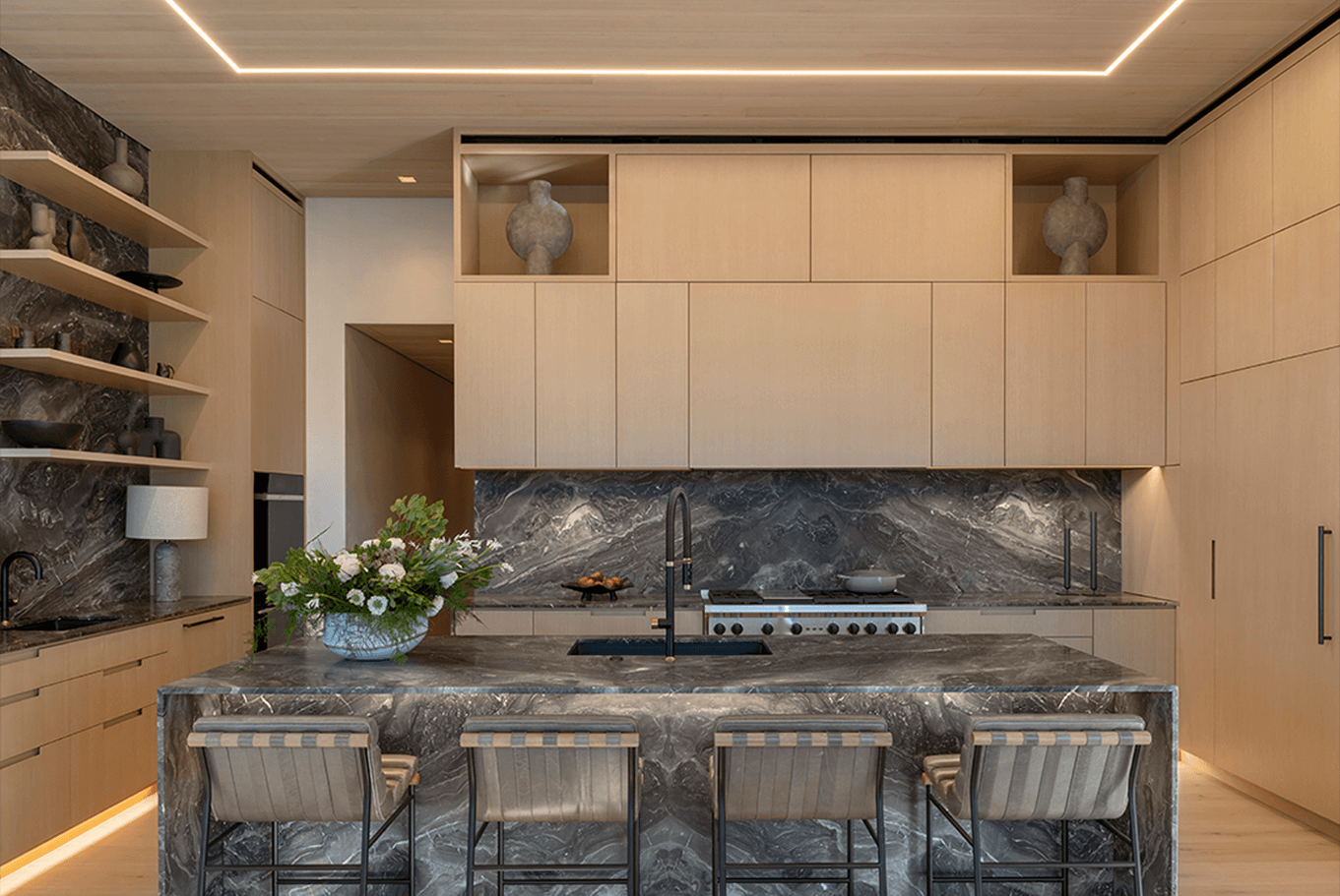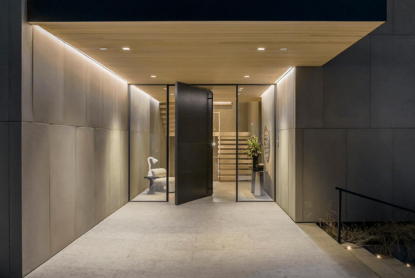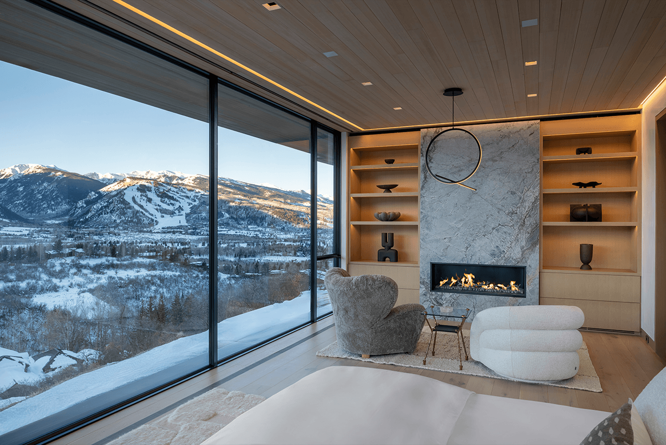 Cut into the mountainside, this tiered home captures daylight and mountain views. Linear details compliment full spectrum downlights to highlight the clean architectural forms and rich finishes.